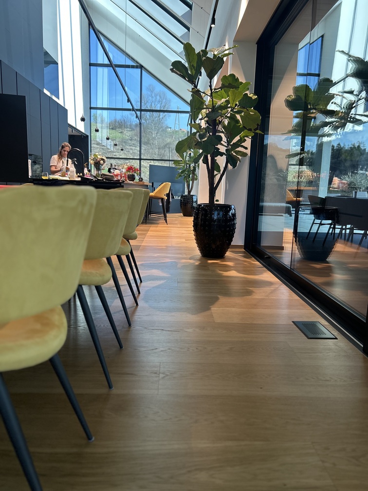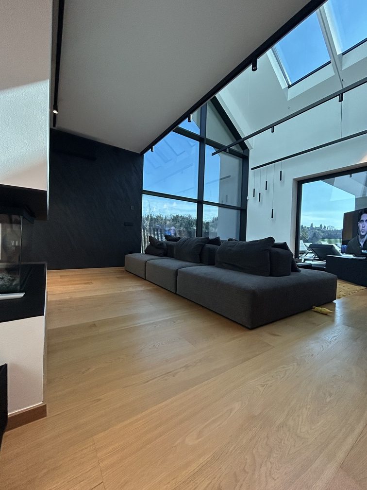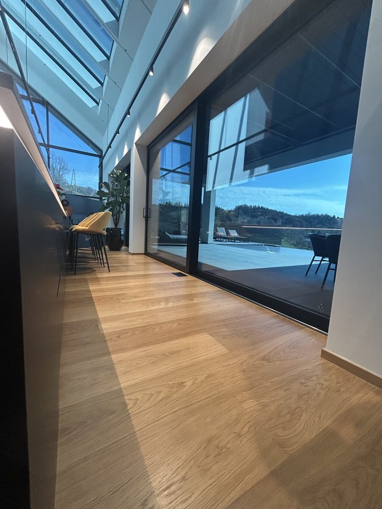 In Šentilj, we participated in the realization of an exceptional project of a modern architectural villa characterized by 12-meter-high ceilings, large glass façade surfaces, and an open floor plan where the architecture creates a strong connection between the interior space and the natural surroundings.