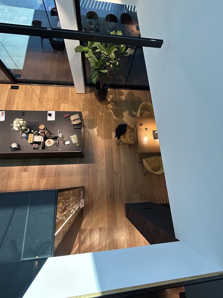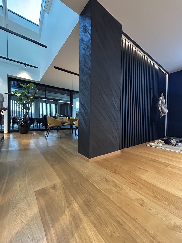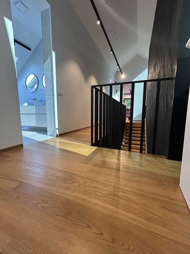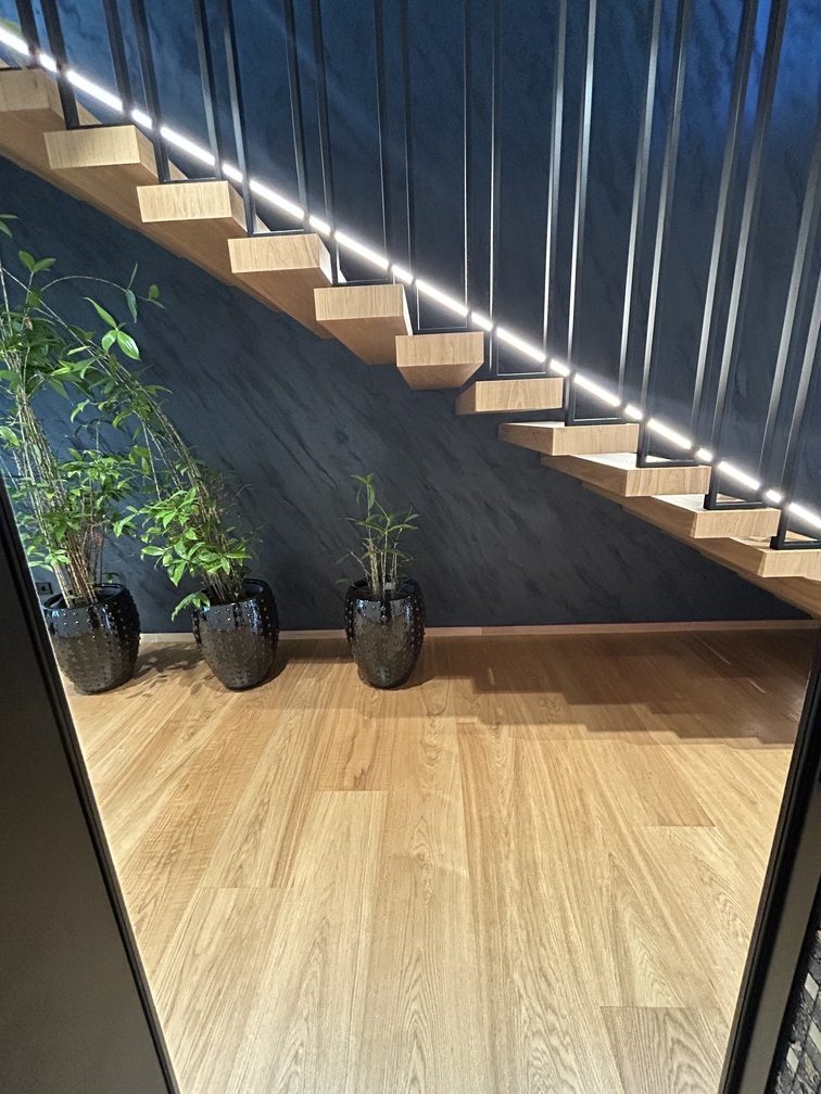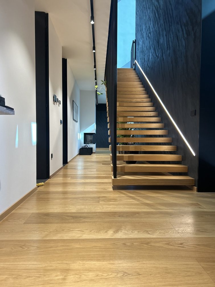 A special architectural highlight of the project are the cantilevered floating stairs, clad with the same oak flooring, creating perfect material continuity. The same oak is also used in the background of the glass wine display, adding a refined architectural detail to the space.