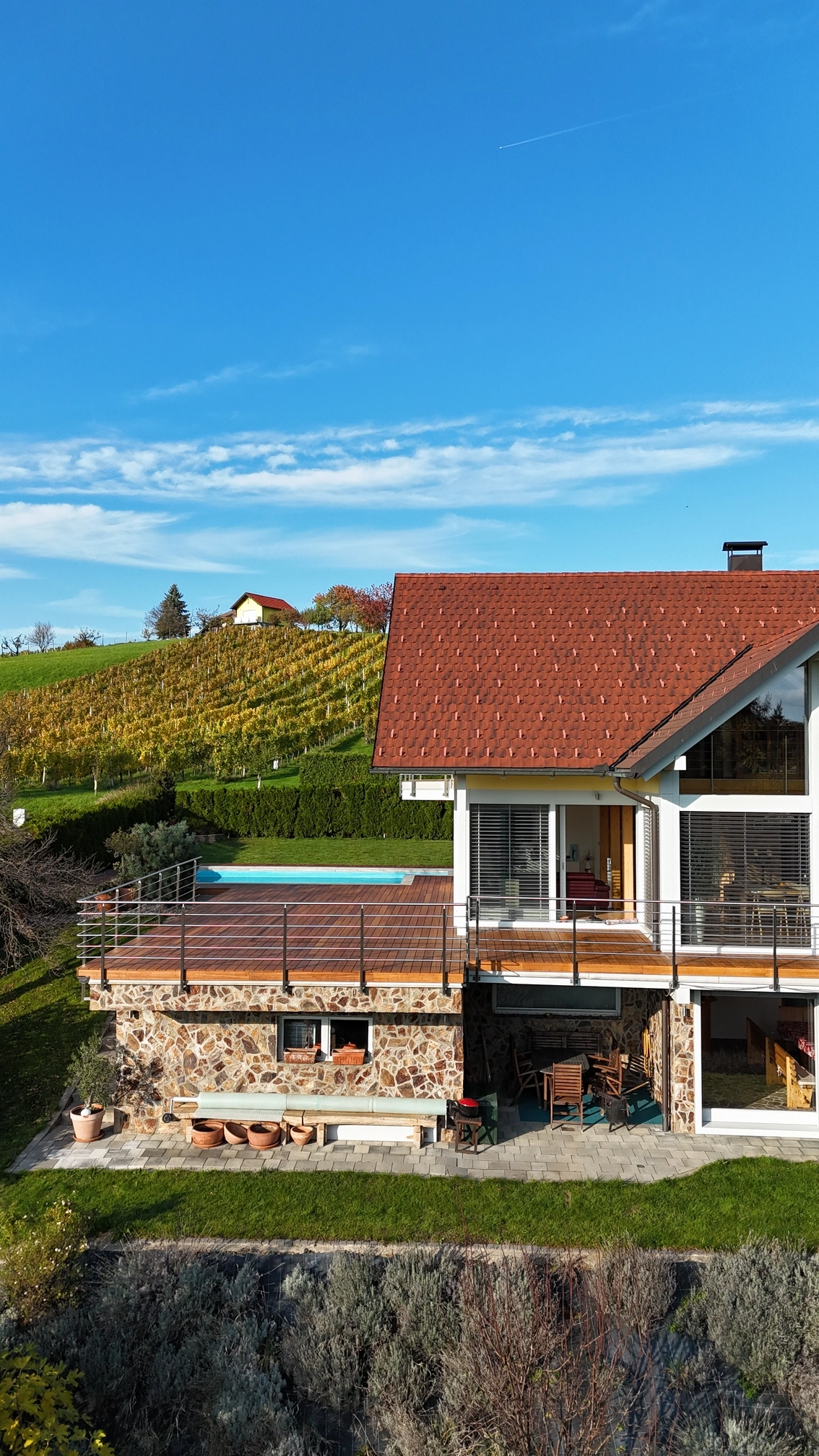 V tem izjemnem projektu smo prenovili zunanji ambient starejše Kager hiše, kjer brezčasna arhitektura sreča sodoben naravni material — Kerowood bambus. Naš sistem smo vgradili okoli bazena, na teraso in balkon, s čimer smo dosegli popolno barvno usklajenost med fasado, detajli in zunanjim prostorom.
